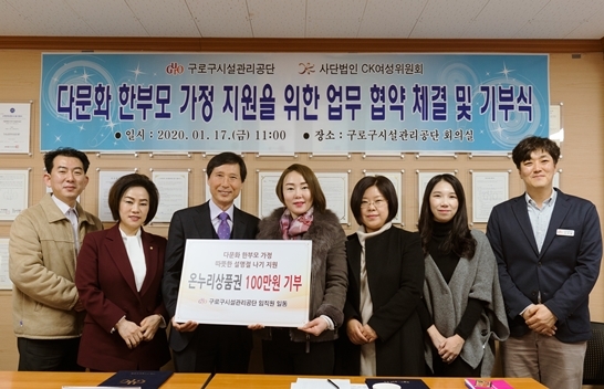 구로구시설관리공단(이사장 유영환)은 사단법인 CK여성위원회(대표 이미화)와 함께 지난 17일 오전 11시 구로구시설관리공단 회의실에서 “다문화 네트워크 수립 및 사회적 지원을 위한 업무협약’ 과 중국동포 한부모가정을 대상으로 설명절 나눔 기부행사를 가졌다.