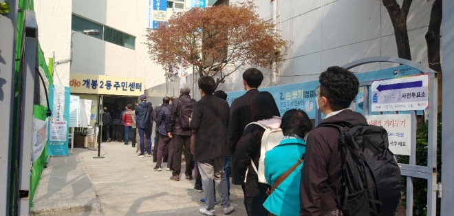 ▲제21대 총선 사전투표 첫날인 19일 개봉2동 주민자치센터에 유권자들이 줄을 서고 있다.
