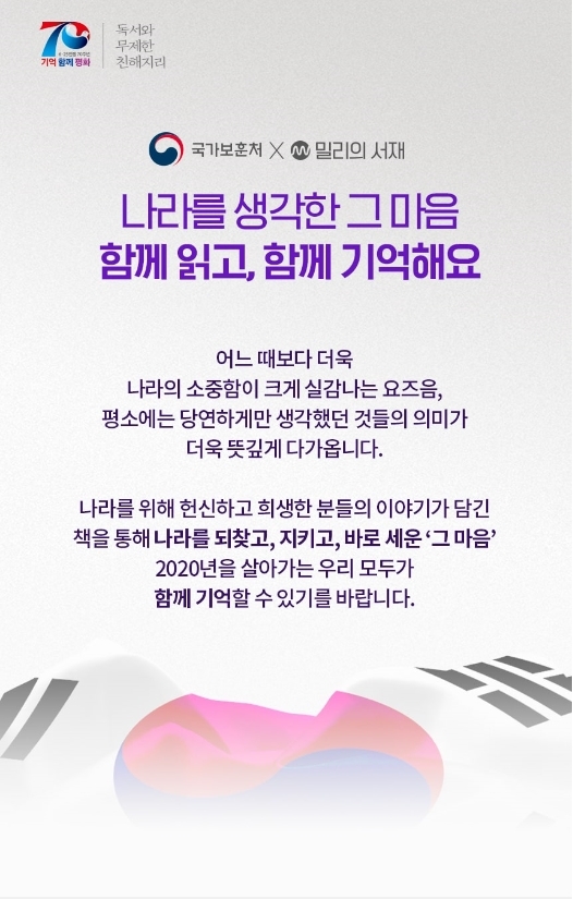 서울남부보훈지청(지청장 양홍준)은 국내 최대 독서 플랫폼 밀리의서재(대표 서영택)와 함께 22일부터 17일간 독서 캠페인을 진행한다고 밝혔다.