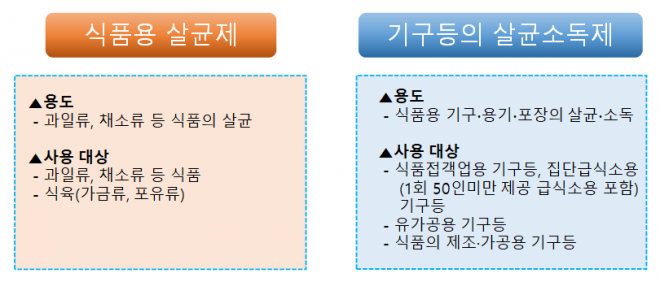 식품첨가물(식품용 살균제, 기구 등의 살균 소독제)은 식품을 제조·가공·조리 또는 보존하는 과정에서 식품이나 식품용 기구·용기·포장에 사용되는 물질이며, 방역용이나 인체 소독용으로 허용된 제품이 아니다.