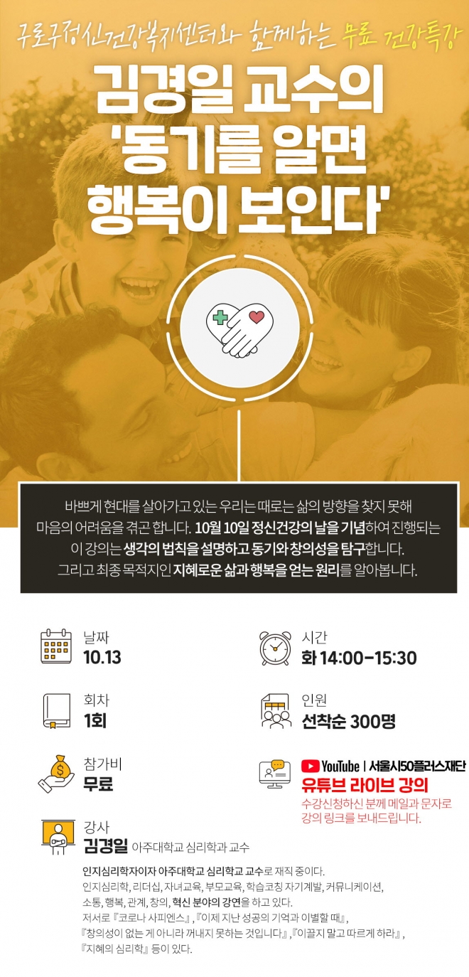 구는 서울특별시50플러스, 구로구정신건강복지센터와 함께 코로나19 장기화로 불안과 우울감이 심해지는 주민들을 위로하기 위해 이번 특강을 준비했다.