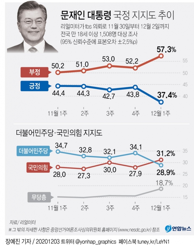 리얼미터가 tbs 의뢰로 지난달 30일부터 지난 2일까지 전국 만 18세 이상 1천508명을 대상으로 조사한 결과, 문 대통령의 국정 수행 지지율(긍정평가)은 전주보다 6.4%포인트 하락한 37.4%였다.