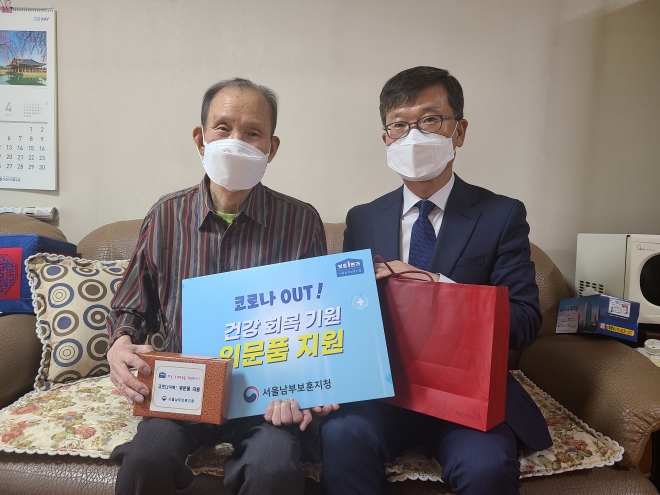 서울남부보훈지청(지청장 용교순)은 지난 13일 코로나19 확진 후 격리해제된 보훈가족 2가구를 방문, 위문품을 전달했다.
