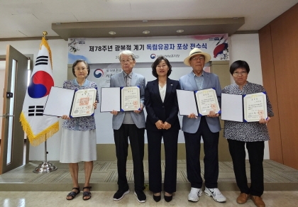 서울남부보훈지청(지청장 김진이)은 지난 8월 18일 서울남부보훈지청 유일한홀에서 故백낙도 지사, 故김동인 지사, 故오주현 지사, 故유기일 지사 유족에게 제78주년 광복절 계기 포상을 전수했다.