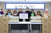 건강식품판매업체 알레(alle) 김시황 대표는 지난 2월9일 구로구청 창의홀에서 멀티비타민, 유기농 컬리케일, 멜라토닌 등 6천여만원 상당의 건강기능식품을 구로구청에 전달했다.<사진> 이 자리에는 김시황 알레 대표, 메이제이 무역 백주옥 대표, 장인홍 구청장, 이경애 희망복지재단 사무국장이 참석했다. <채홍길 기자>